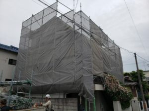 高所作業車の入れない密集した住宅地等においては、足場を設置しての作業となり足場費用が必要となります。